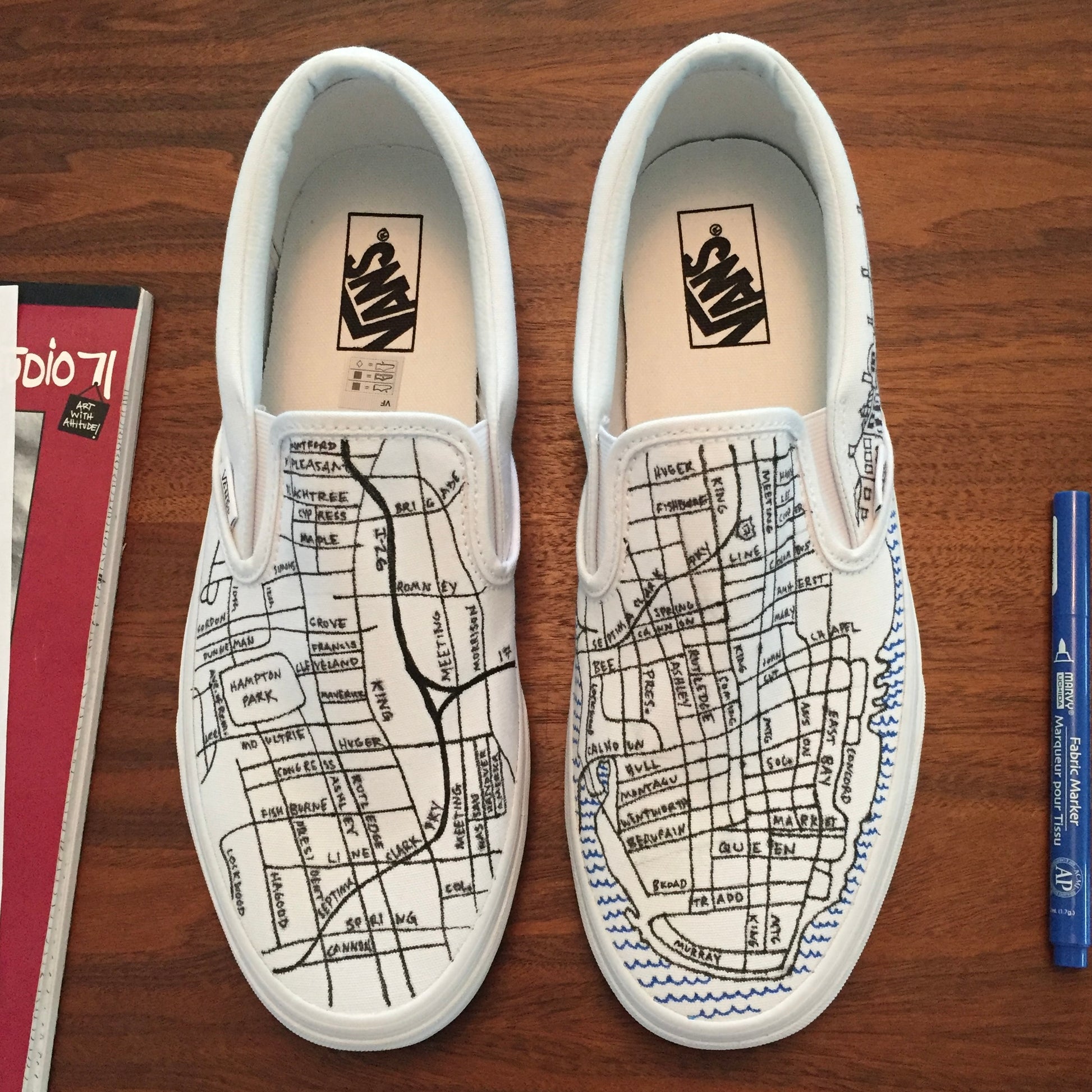 This unique map reimagines the Charleston peninsula on the medium of canvas slip-on Vans. The side panels and heels feature intricate illustrations of Charleston landmarks.