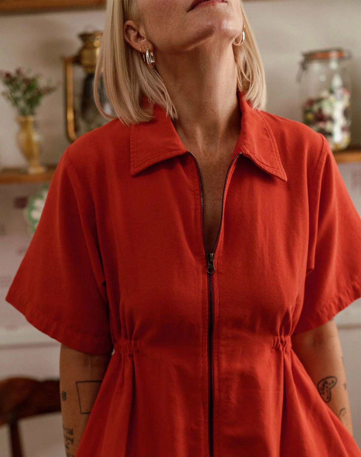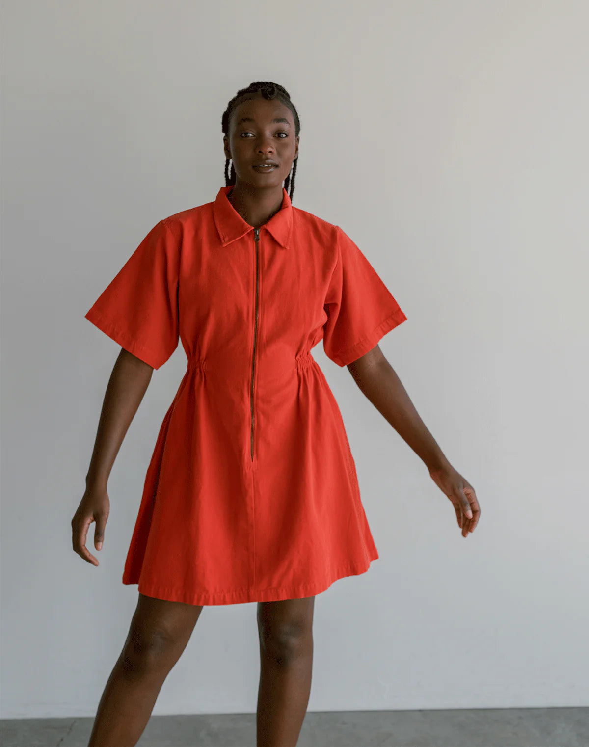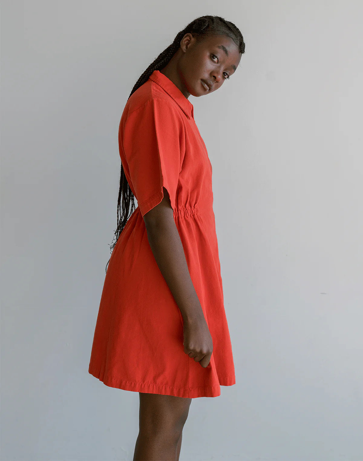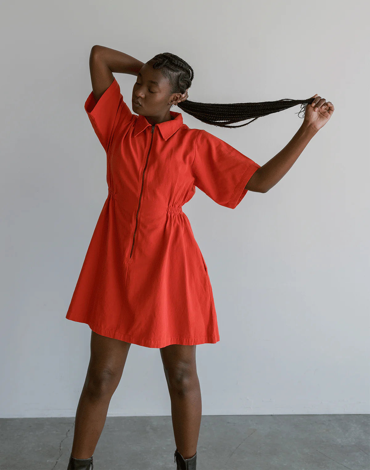 Noble's signature Utility Dress features oversized sleeves and a cinched elastic waist and full skirt for a flattering, comfortable fit. BONUS: giant pockets for all of your stuff. Made from durable yet buttery-soft 8oz Pima cotton canvas, GOTS-certified organic and fully traceable from plant to product. Garment-dyed with eco-friendly processes, each piece is pre-washed and pre-shrunk for an ultra-soft feel and impeccable fit.