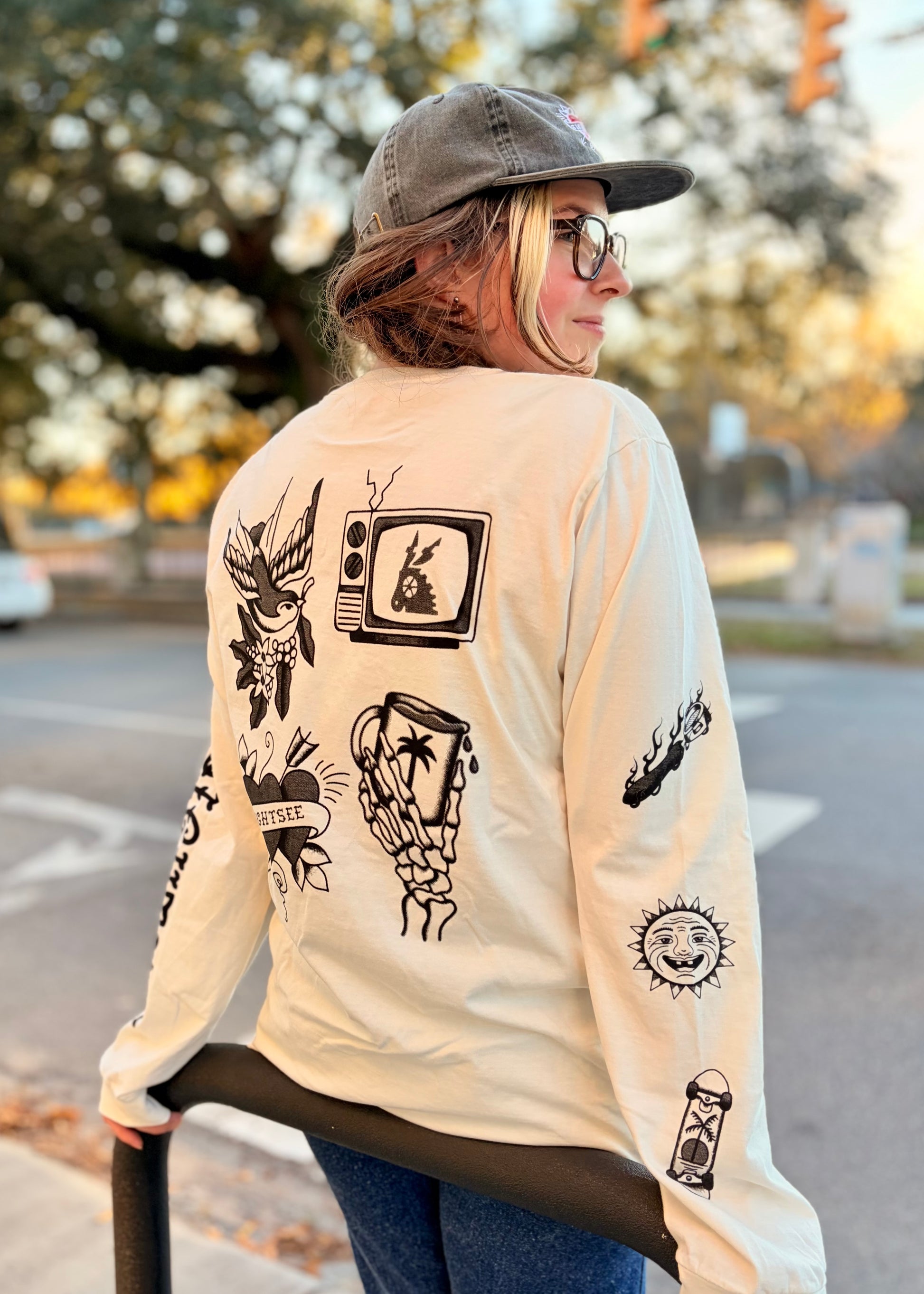 For when you realllllly want some Sightsee ink but you're feeling non-committal. This super comfy long sleeve tee features an entire flash sheet's worth of tattoo illustrations, hand-drawn by our very own tattoo-artist-in-residence, Emilie Williams.