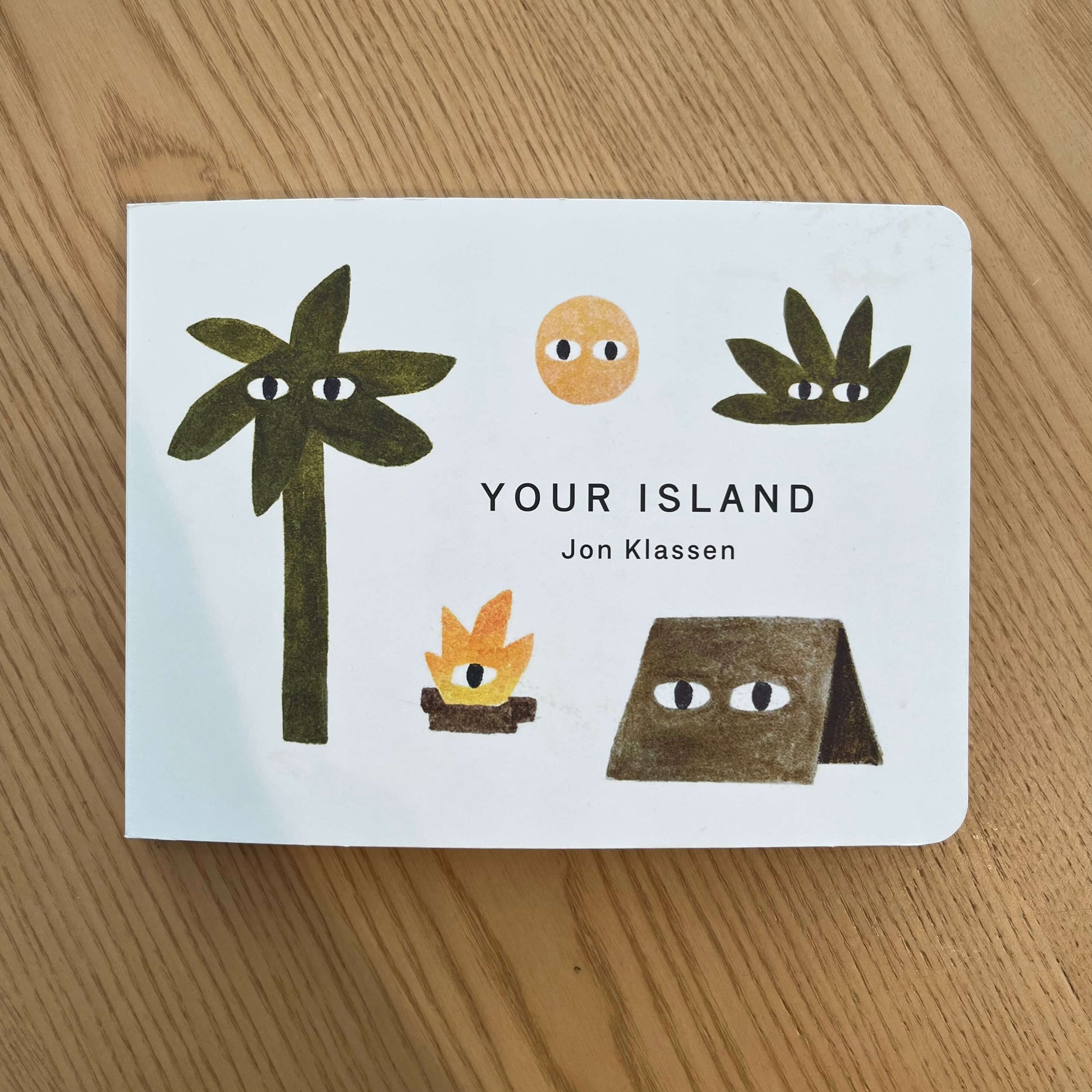 With a minimal tableau of familiar objects and a gentle rhythm suited for reading aloud, an island and all its items—a tent, a fire, a boat, a bird—are assembled, ending with bedtime as the sun goes down. This is an island for a young child to have whenever they want to go there. One in a trio of board books focusing on safe spaces, comfort, and imagination, Your Island signals both a departure for Jon Klassen and a story whose peculiar touches of whimsy stamp the book as iconically his.